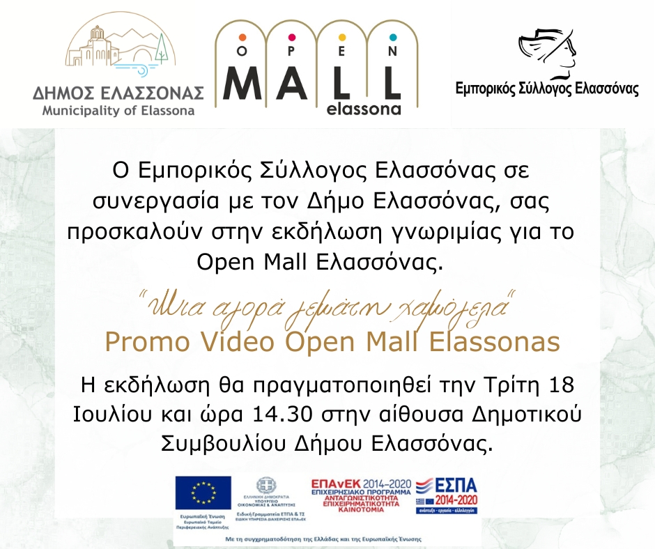 Και σας προσκαλούν σε ενημερωτική εκδήλωση με θέμα παρουσίαση του σήματος- λογότυπο και το promo video του Ανοιχτού Κέντρου Εμπορίου Ελασσόνας την Τρίτη 18 Ιουλίου 2023 και ώρα 14.30 στην αίθουσα Δημοτικού Συμβουλίου Δήμου Ελασσόνας.