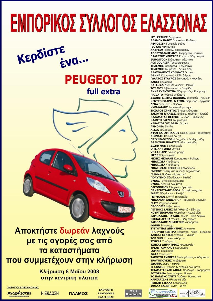 Στην εκδήλωση θα γίνει η επίσιμη παρουσάση της νέας διαφημηστικής καμπάνιας του Εμπορικού Συλλόγου Ελασσόνας. Για το χρονικό διαστημα απο 20-12-2007 έως 08-05-2008 ένα Peugeot 107 Full Extra προσφορά των μελών του , που θα περιμένει τον υπερτυχερό που θα το κερδίσει στην κλήρωση που θα γίνει την Πέμπτη 08-05-2008 .