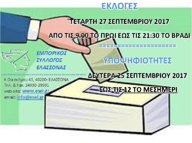 Όσοι επιθυμούν να θέσουν υποψηφιότητα στα όργανα του Συλλόγου πρέπει να υποβάλλουν αιτήσεις υποψηφιότητας προς τον Εμπορικό Σύλλογο, το αργότερο μέχρι την Δευτέρα 25 Σεπτεμβρίου 2017 έως τις 12:00 το μεσημέρι, στην εφορευτική επιτροπή στα γραφεία του συλλόγου.