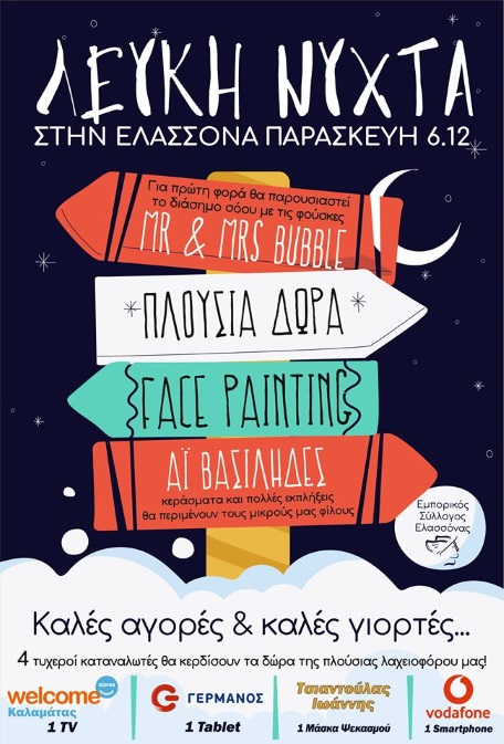 Η Διοίκηση του Εμπορικού Συλλόγου Ελασσόνας συμμετέχοντας στις εκδηλώσεις του Δήμου μας, αποφάσισε κατά την εορταστική περίοδο Χριστουγέννων και Πρωτοχρονιάς, τη διοργάνωση δράσεων, με σκοπό την δημιουργία εορταστικής ατμόσφαιρας στην πόλη μας.