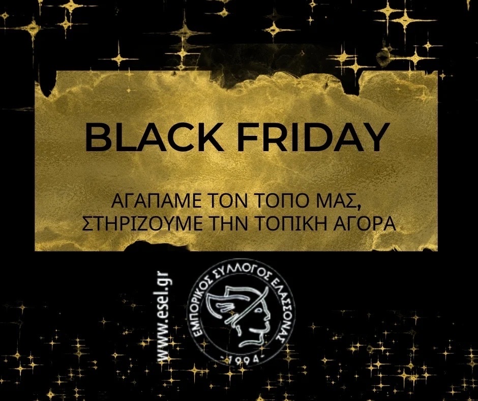 | Ο Εμπορικός Σύλλογος Ελασσόνας σεβόμενος τους επιχειρηματίες της πόλης ενόψει Black Friday καλεί τους πολίτες να κάνουν τις αγορές τους από την τοπική αγορά ενισχύοντας έτσι την πόλη του.
